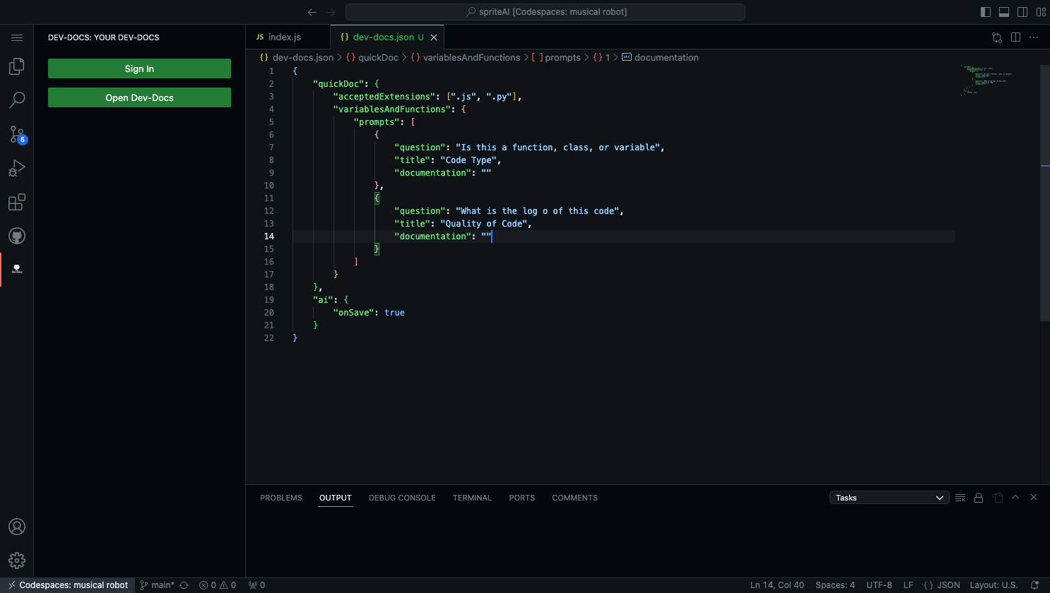 You can then customize the questions you want the AI To answer from your code by adusting the questions in the JSON or adding new ones to the JSON. The title can be thought of as a header within your documentation. Here you can also set the AI to run every time you save by keeping the "onSave" prompt as true. Alternatively, you can turn the auto generate on save feature off by setting the "onSave" prompt to false.